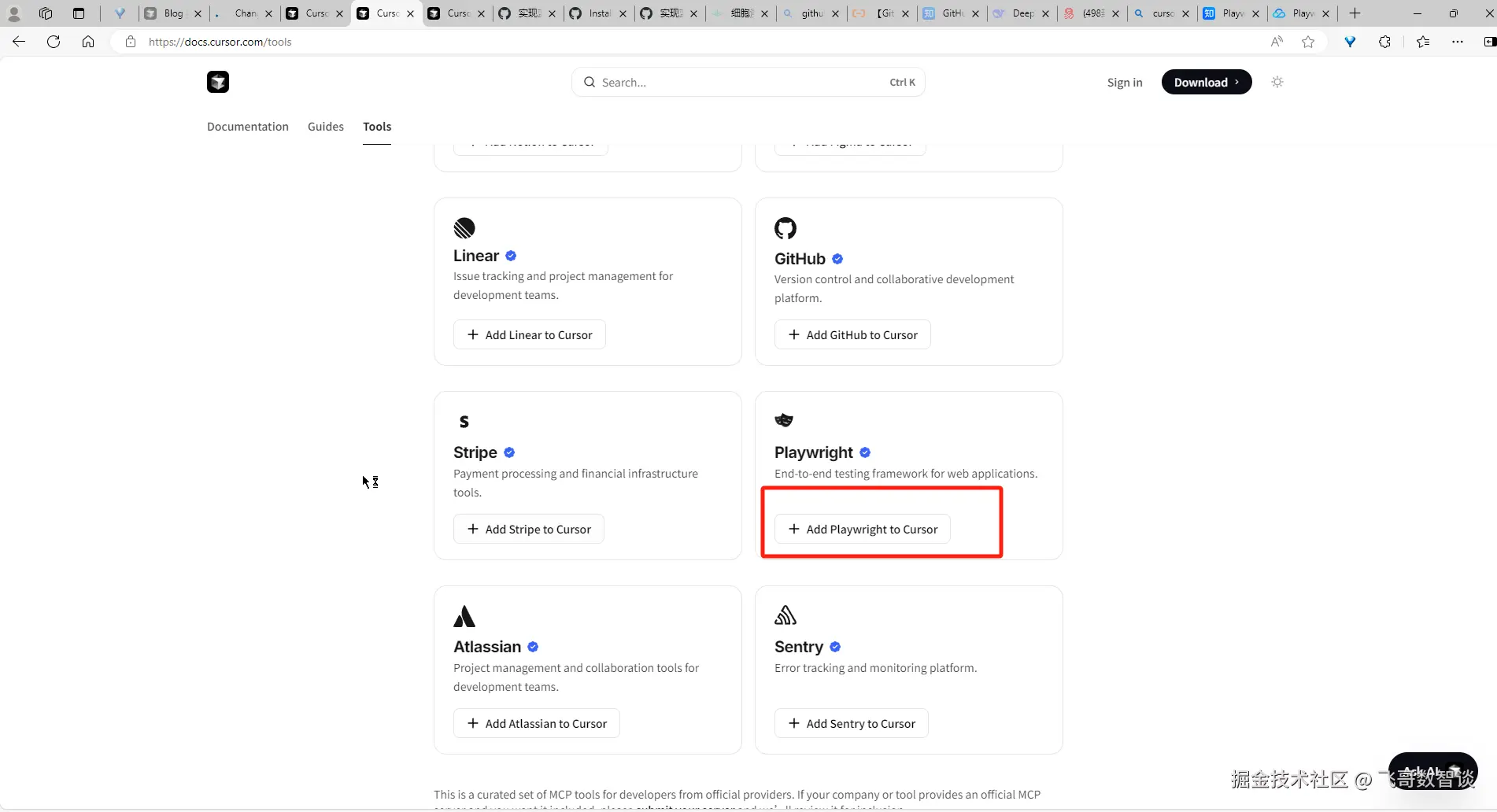 1、打开官方 Tools 页面。docs.cursor.com/tools,点击“Add Playwright to Cursor”按钮。