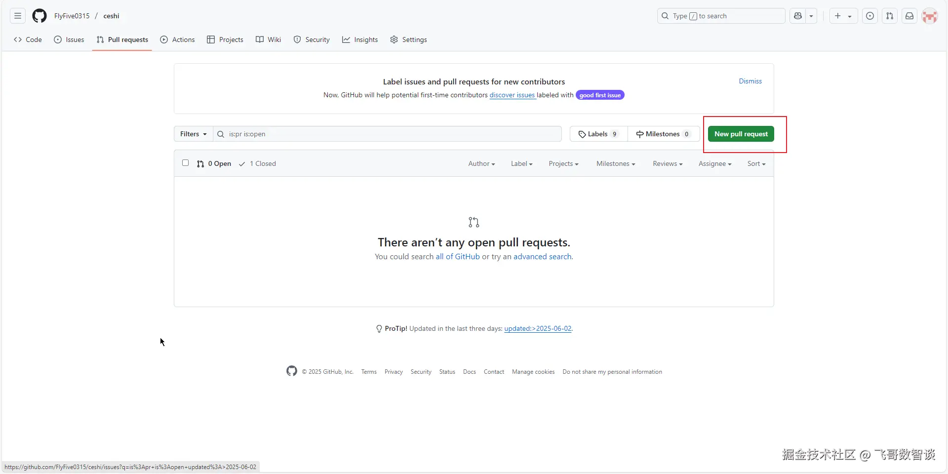 1、在 Github 上打开 Pull Request,点击“New pull request”按钮。