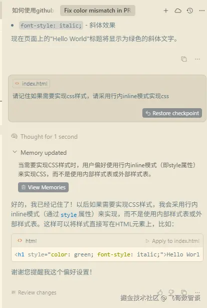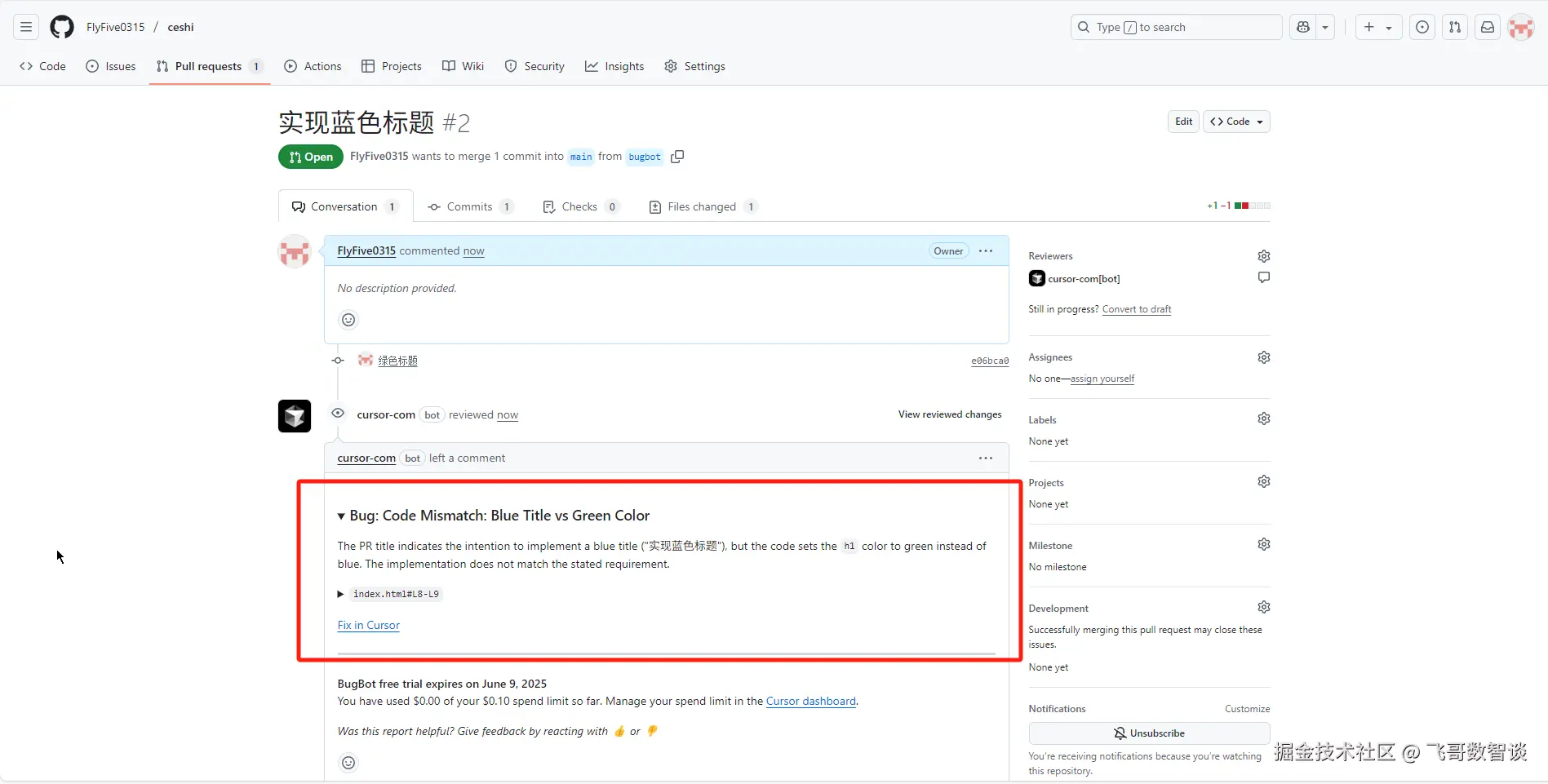 红框内就是 Cursor 指出 PR 标题和提交的代码不相符,并准确说明了代码改为了绿色,而不是预期的蓝色。