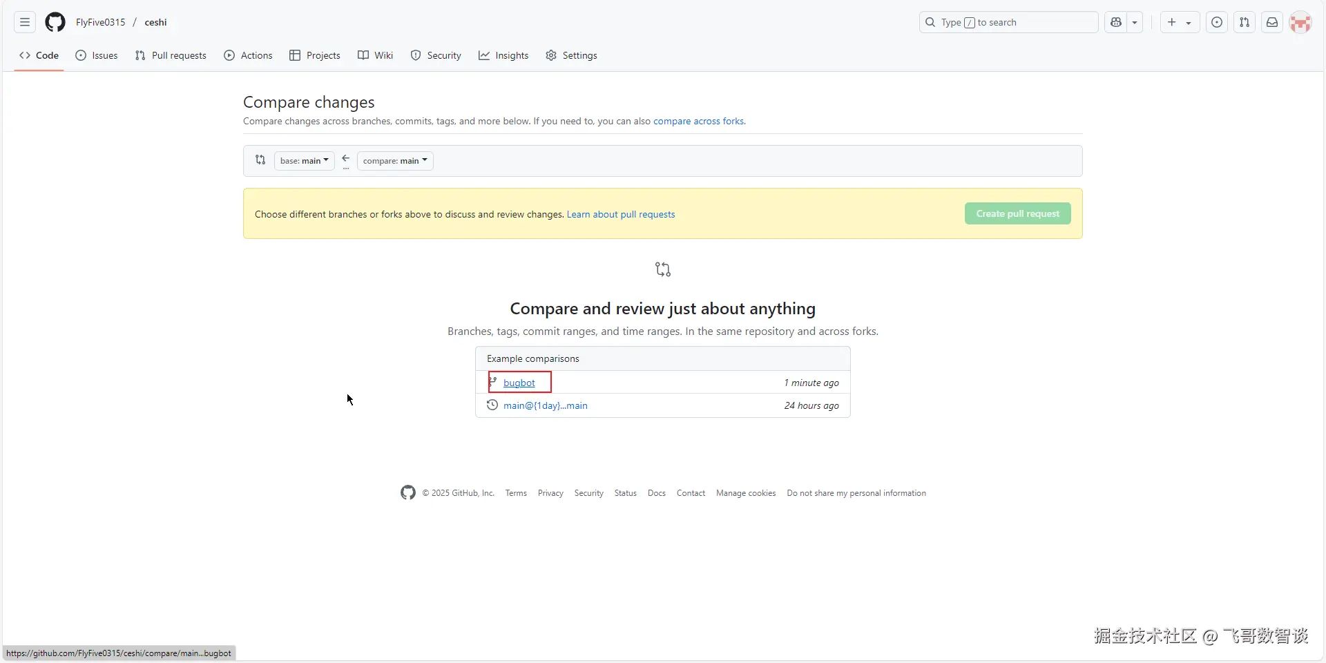 2、选择更改代码的分支bugbot,并点击“Create pull request”按钮。