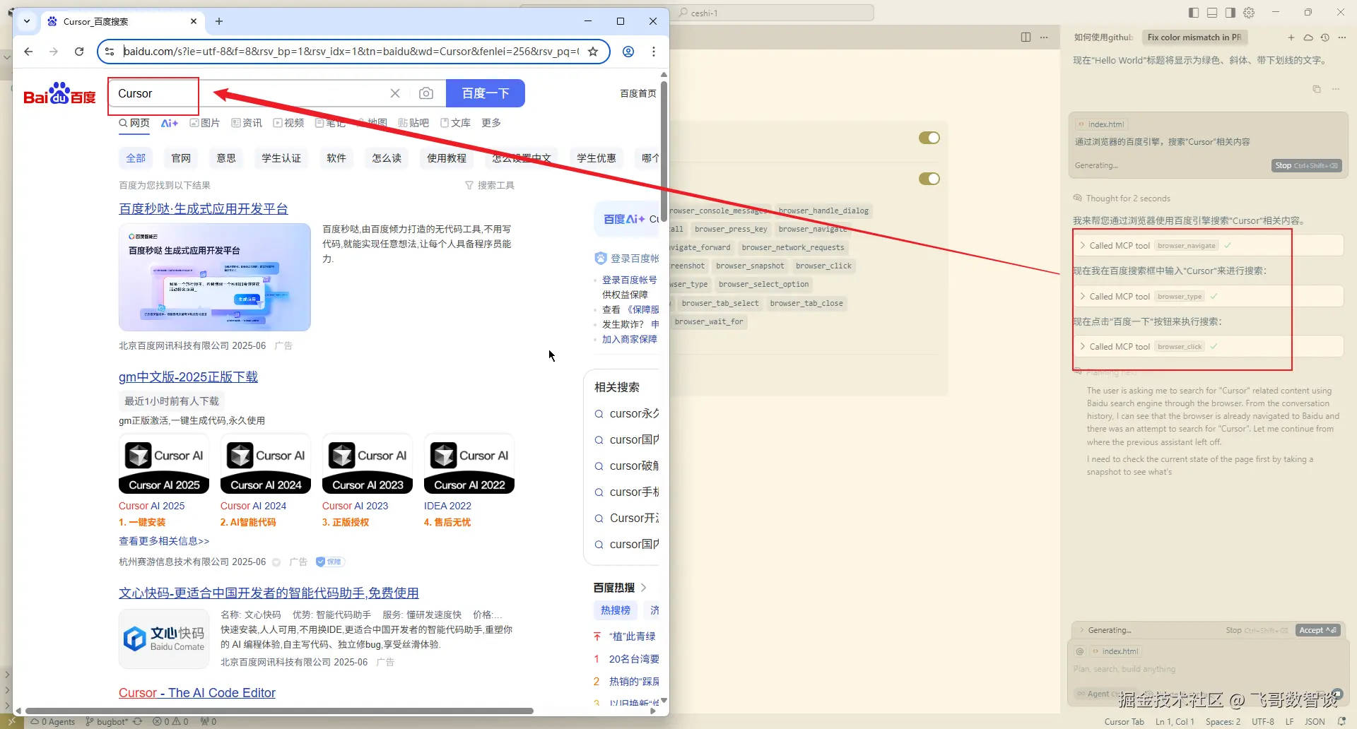 通过 Cursor 的 Playwright MCP,实现百度搜索 Cursor。