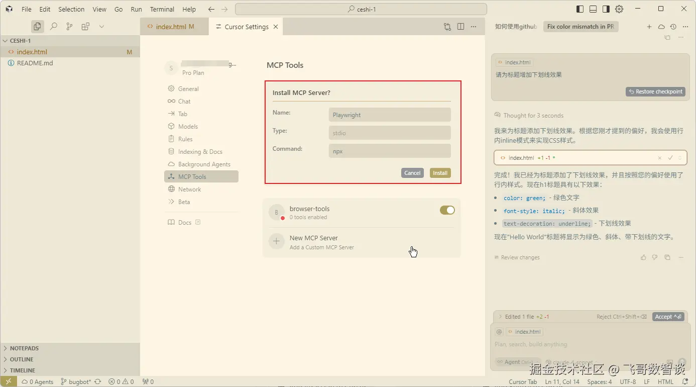 3、点击“Install”后,Cursor 会自动安装 Playwright,并配置好 MCP 服务器。