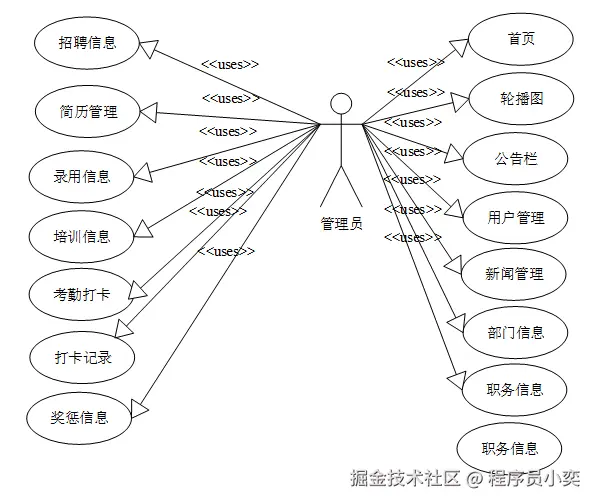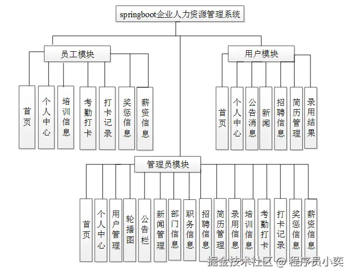 系统设计的目的是分析系统包括的所有功能结构,为开发人员设计开发和实现系统做好准备工作。经过前期的需求调查、分析和整理之后,确定的总体需求主要包括多个模块,分别是:部门信息、职务信息、招聘信息、简历管理、录用信息、培训信息、考勤打卡、打卡记录、奖惩信息、薪资信息。系统整体角色分为两个部分,一是员工、最后是管理员。权限分布也是很明显,员工是在除去浏览信息之外还具有查询和管理自己账户信息、管理员是最高权限拥有者。