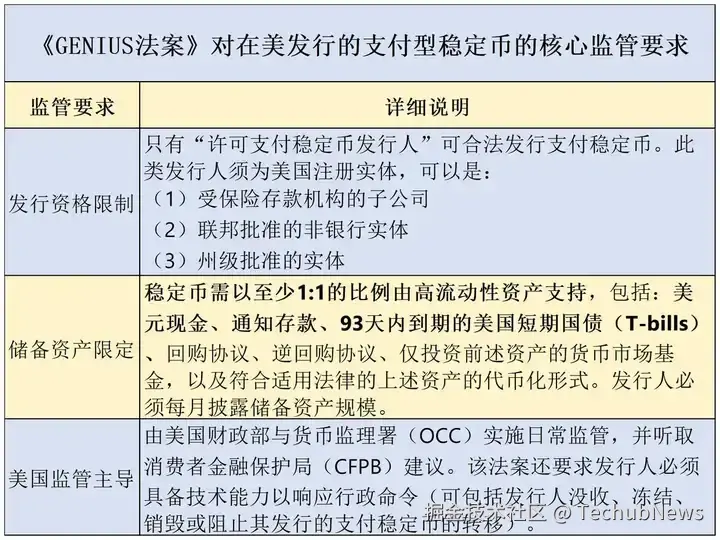 美元稳定币有规则限制。《GENIUS法案》规定,稳定币储备资产必须以至少1:1的比例由美元现金、通知存款及93天内到期的美国短期国债等高流动性资产支持。这是为了防止出现类似双倍花的情况,避免和印钞一样的后果。