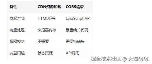 对比CORS:"CORS解决的是JS发起的跨域请求,与标签加载机制不同"
