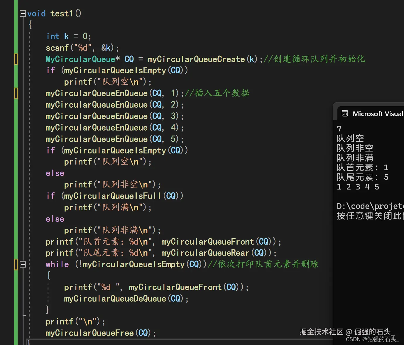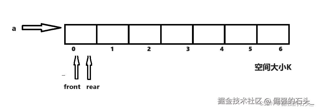 - 为数组指针的指向地址分配一块动态申请的内存,大小为k+1个空间,但实际使用k个(不申请k个是为了区别队列空和队列满,保留一个空间)