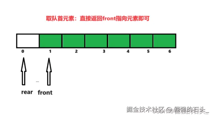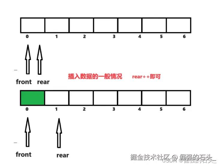 - front和rear初始为0(要注意rear初始为0,意味着指向的是队尾的下一个元素)