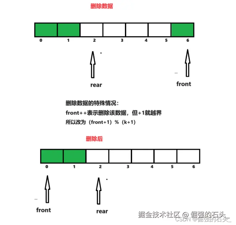 - 如果有数据可出的话,直接调整front的位置即可(不过应当考虑循环值溢出的问题)(front+1)%(k+1)