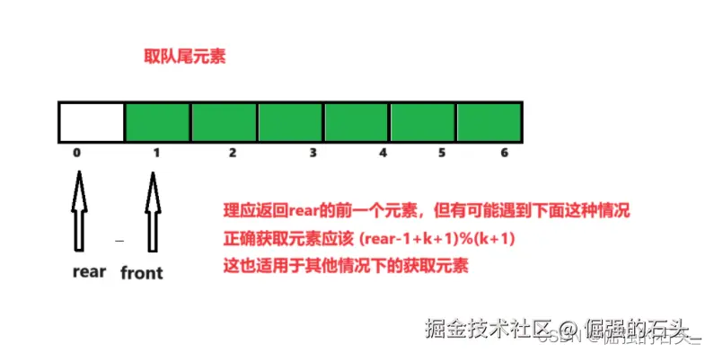 - 队尾元素是rear位置的前一个元素,考虑到直接-1可能会出错,正确的位置应该是(rear - 1 + k + 1) % (k + 1),也可以简化成(rear +k ) % (k + 1)