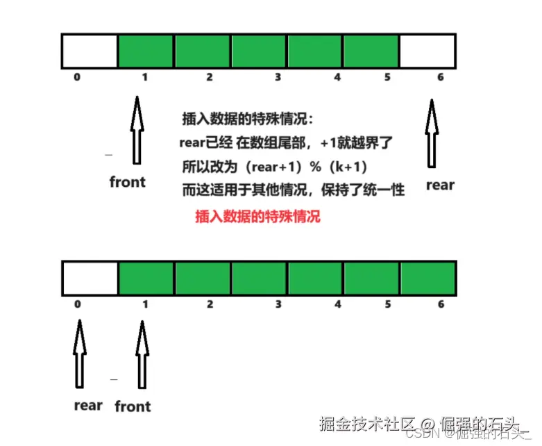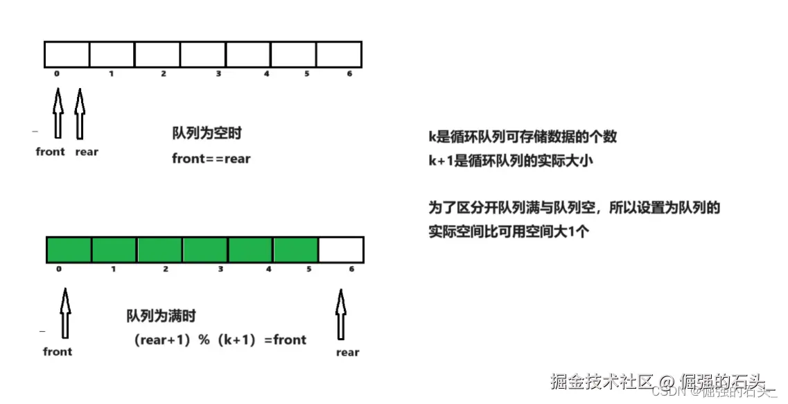 - 队列满的条件理应是rear+1==front,但考虑到队列是一个"环形"的,要考虑值的溢出,所以改为(rear + 1 )% (k +1)==front