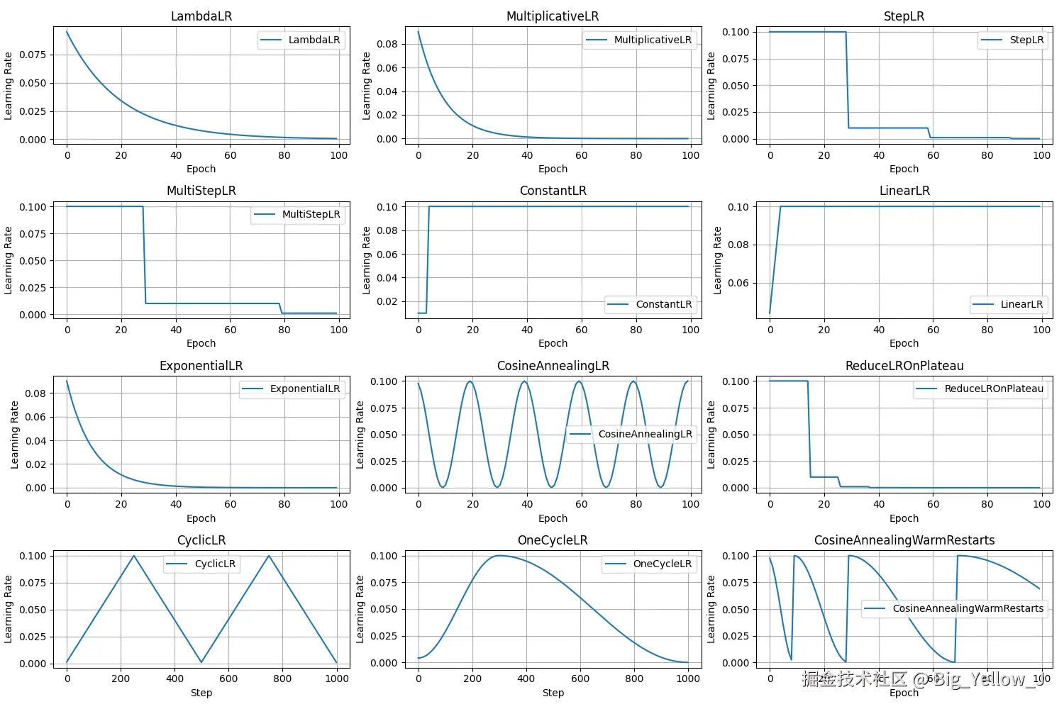 上面已经介绍了 torch.optim.lr_scheduler这里直接进一步解释其各类方法以及代码实战。其中在 torch.optim.lr_scheduler 中大部分调整学习率的方法都是根据epoch训练次数。直接总结如下所示: