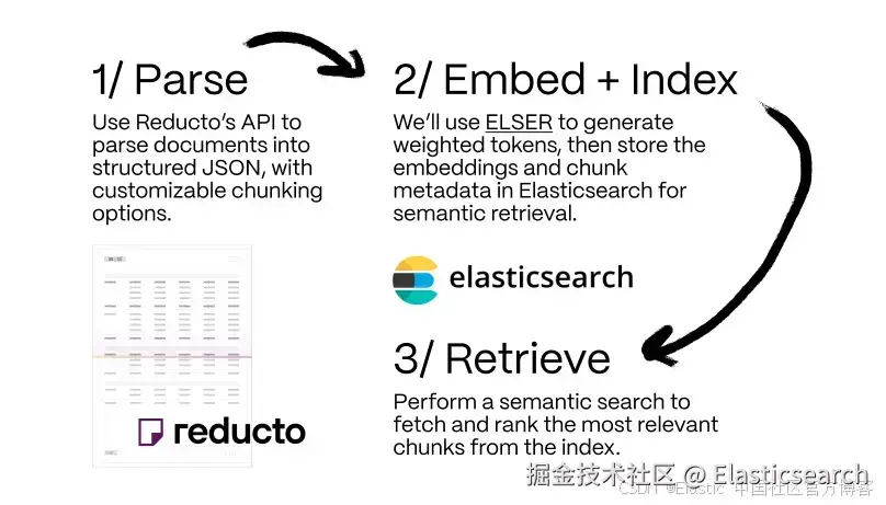 演示如何将 Reducto 的文档处理与 Elasticsearch 集成以实现语义搜索。