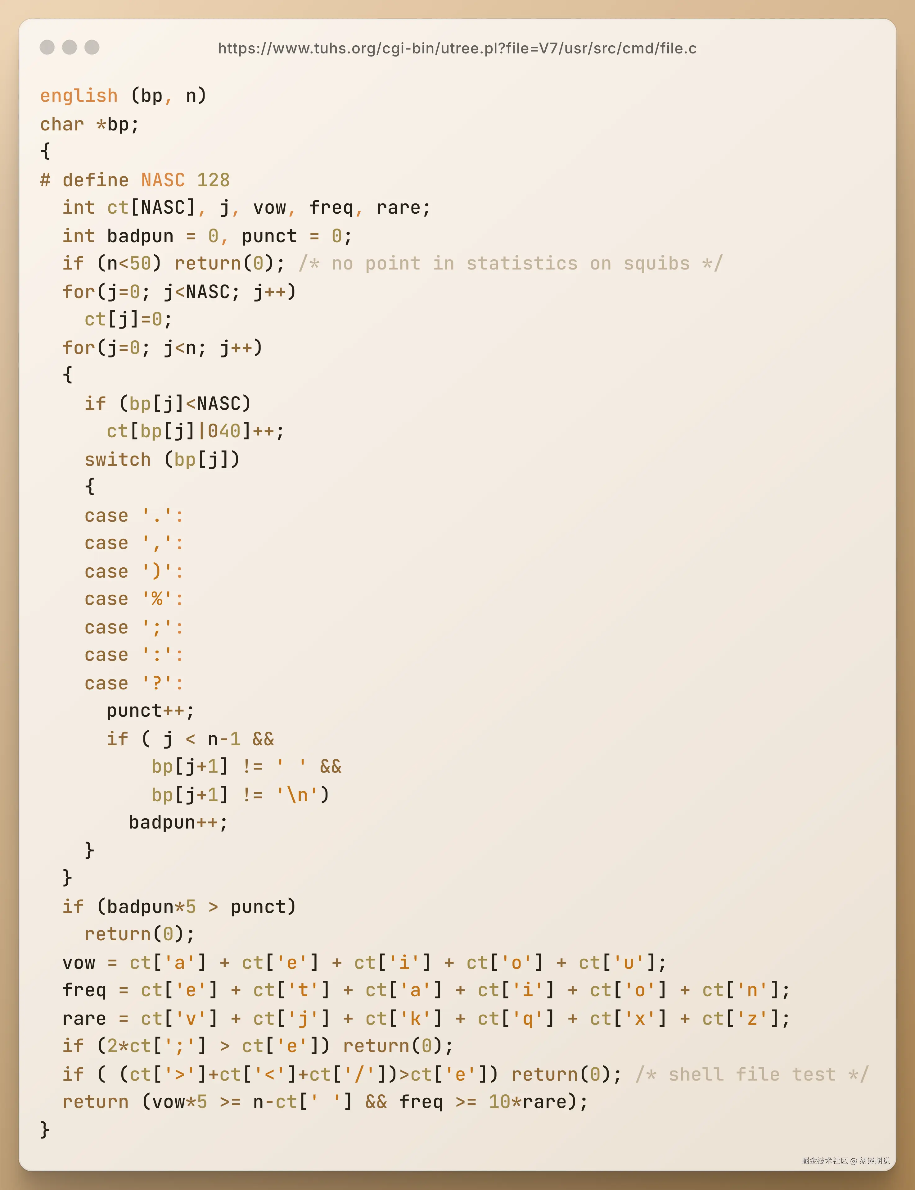 相比之下,1979 年的这段 english() 函数虽然原始,却展现了早期计算的美学:在资源有限的条件下,用最简单的方法尽可能准确地解决实际的问题。