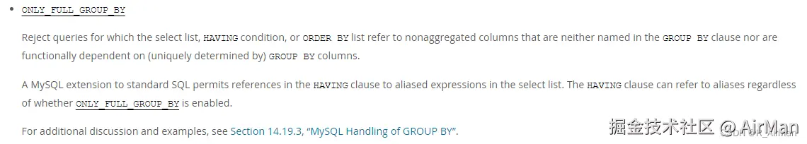 ONLY_FULL_GROUP_BY 是 MySQL 的一种严格 SQL 模式,开启后要求 select、HAVING 和 ORDER BY 中出现的每个非聚合字段,都必须在 GROUP BY 子句中声明,或者能被 GROUP BY 字段唯一决定,否则查询会被拒绝;但 HAVING 子句可以直接引用 select 里的别名。具体网址在下面,感兴趣的可以进一步阅读一下:
