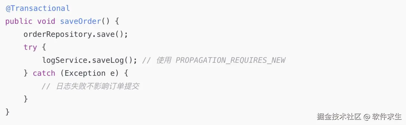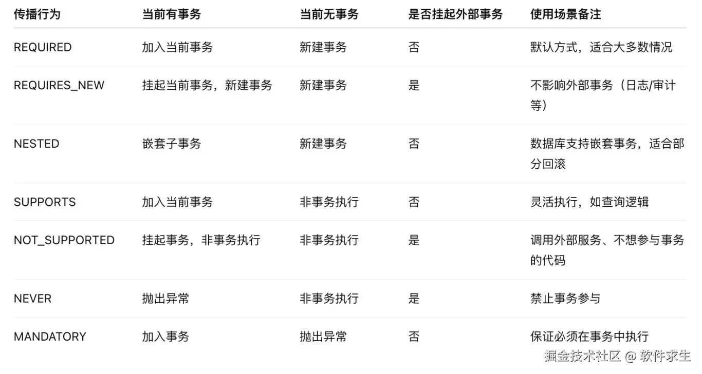 - 真的极少用,除非你确定某段逻辑不能被事务管理(比如某些审计操作)。