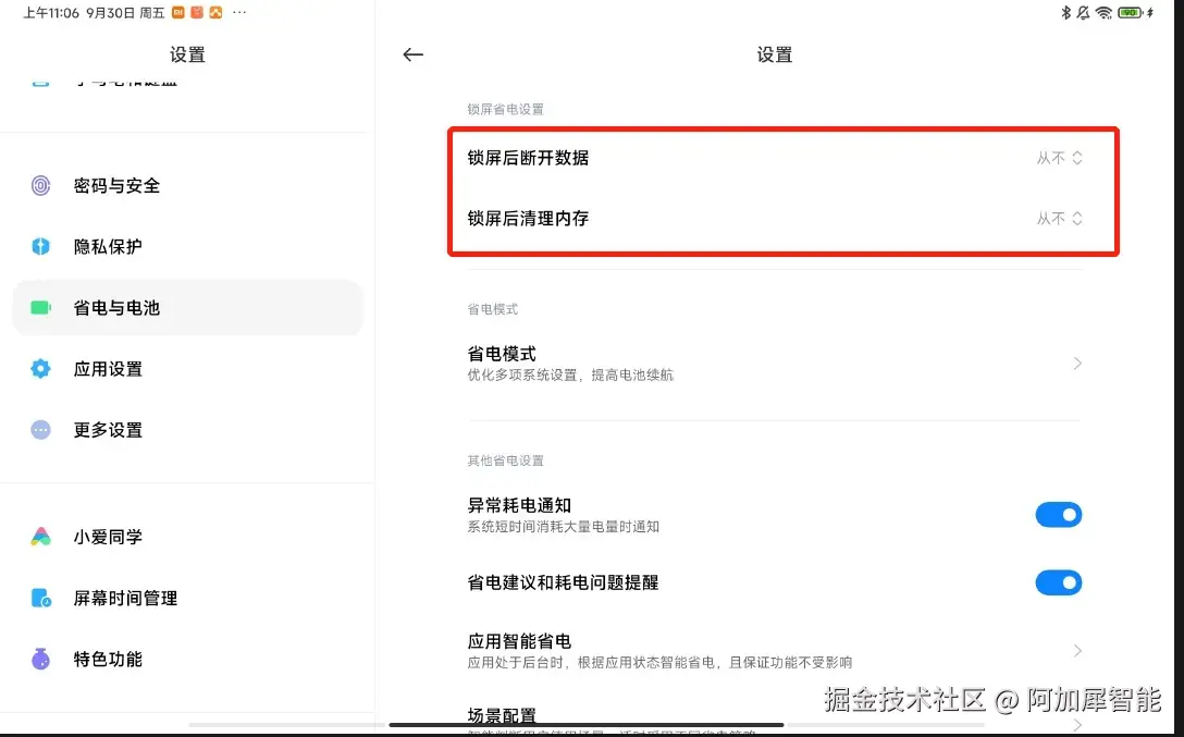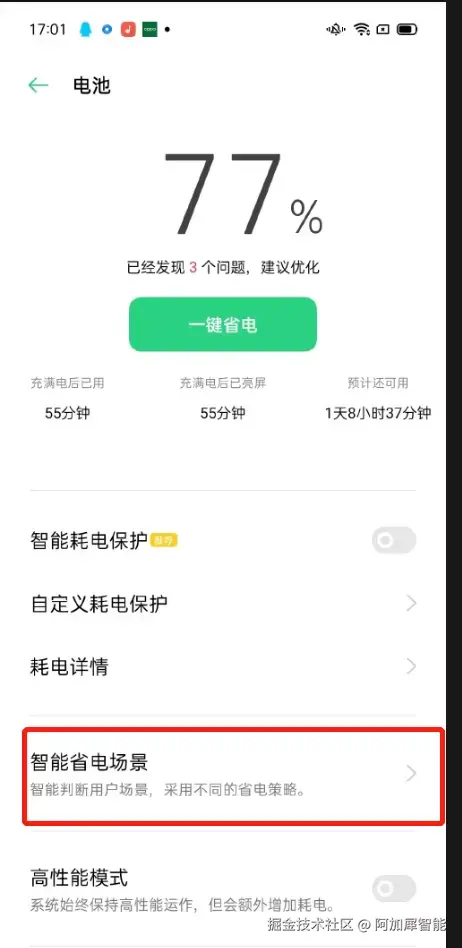 第七步:关闭智能省电场景——这样可以让AidLux在锁屏状态下,你开启的后台服务也不会中断
