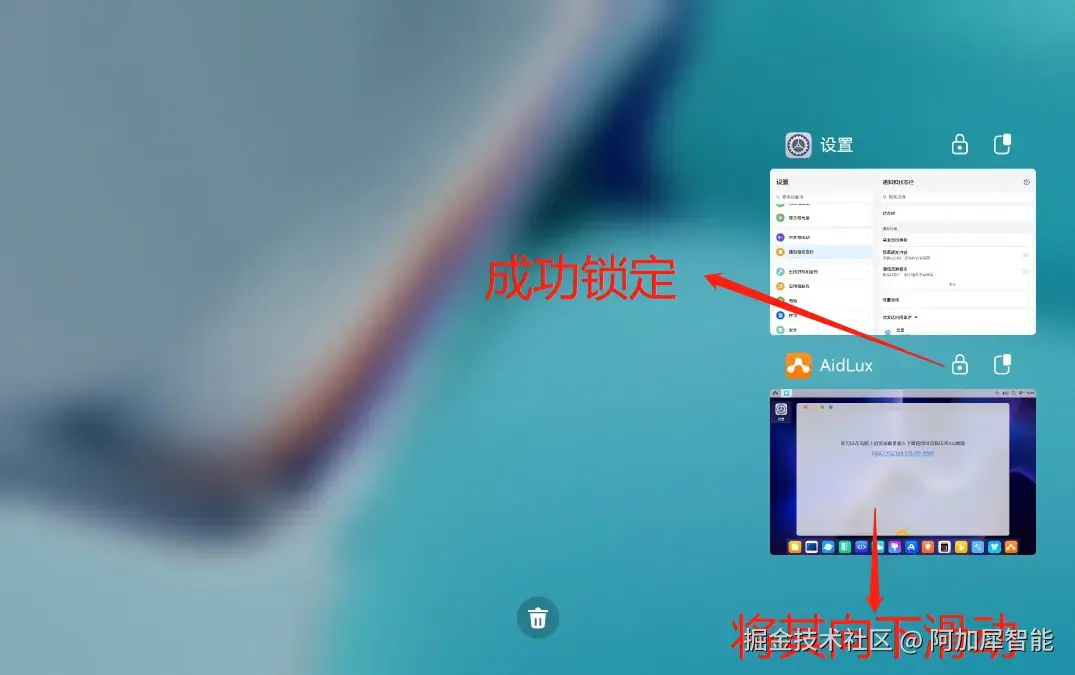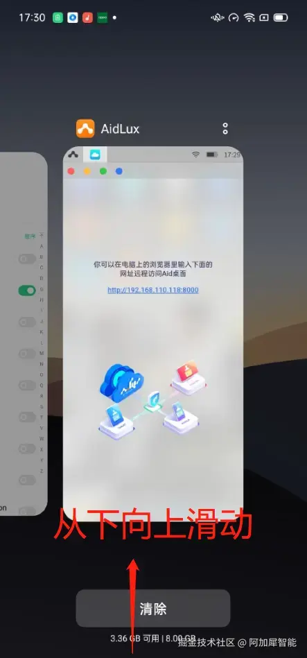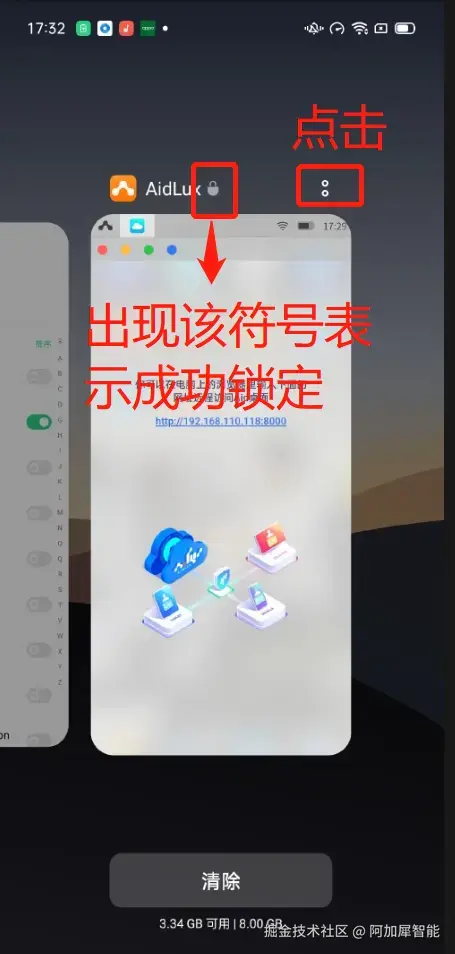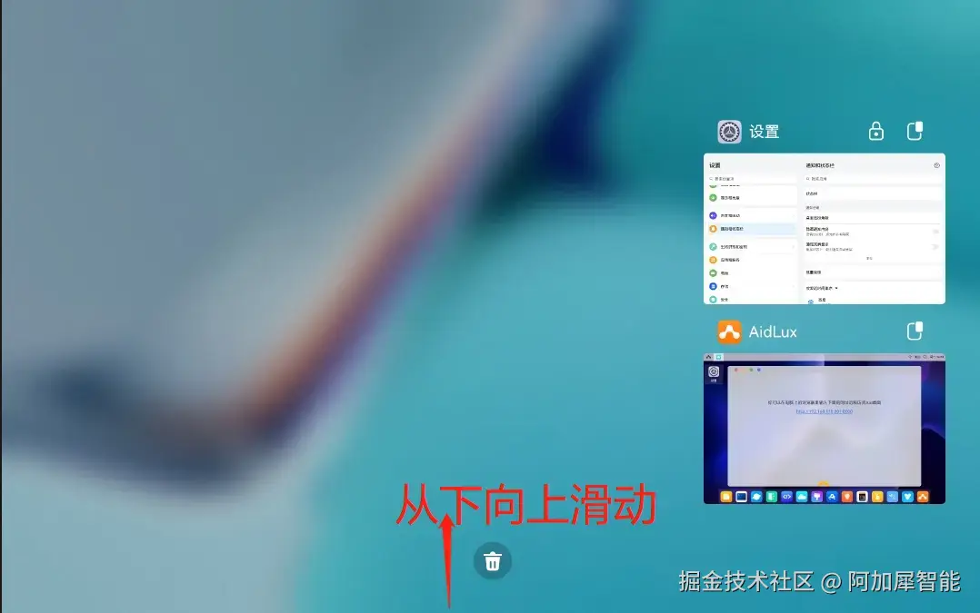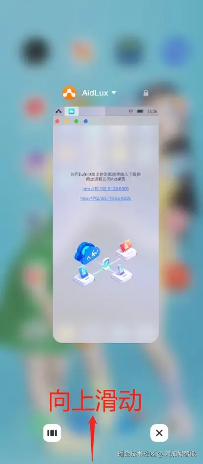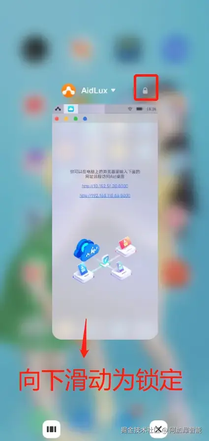 第六步:锁定AIdLux后台运行 从屏幕下方向上滑动,进入多任务管理