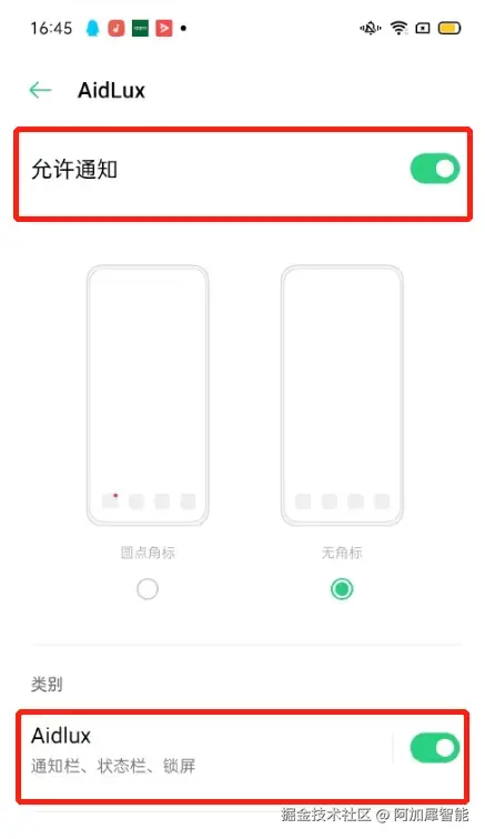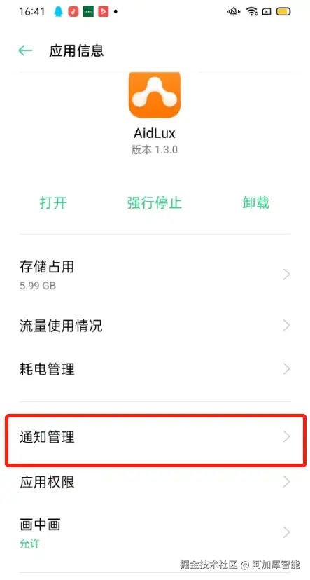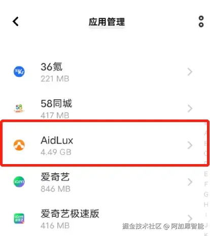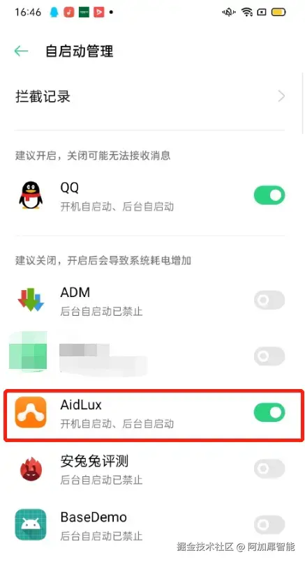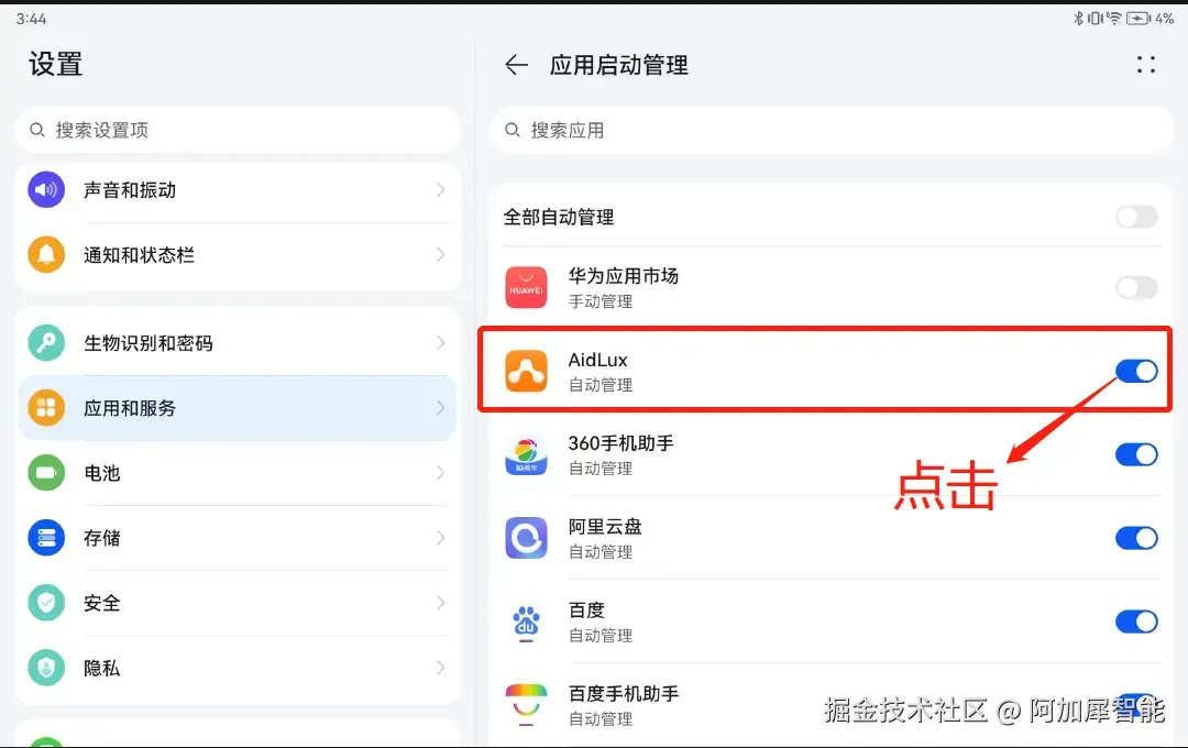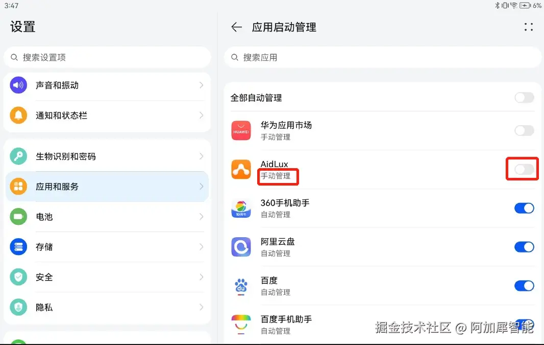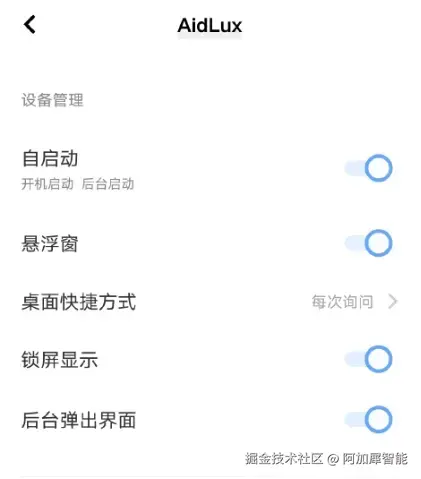 设置后的状态,AidLux的下标签为手动管理,蓝色滑动按钮变为灰色: