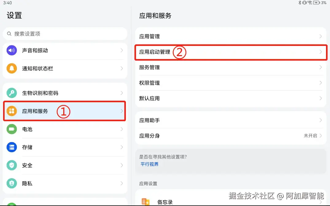 第一步:点击设置——应用和服务——应用启动管理: