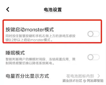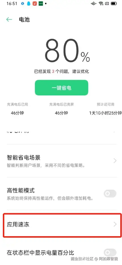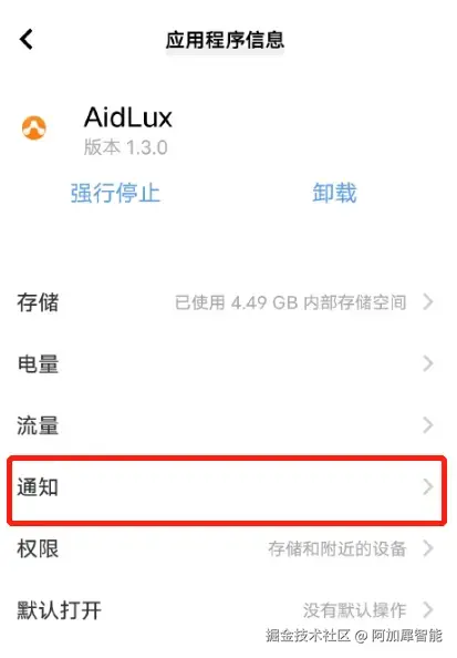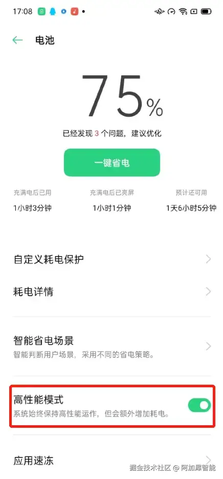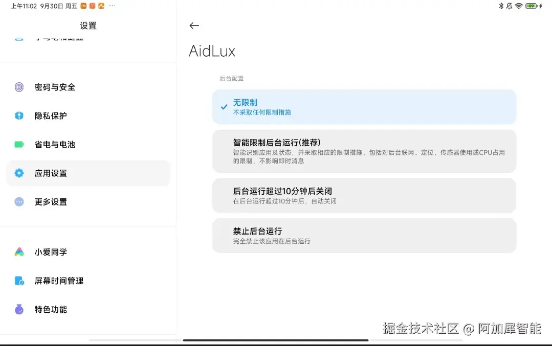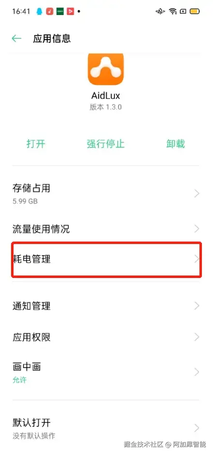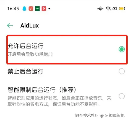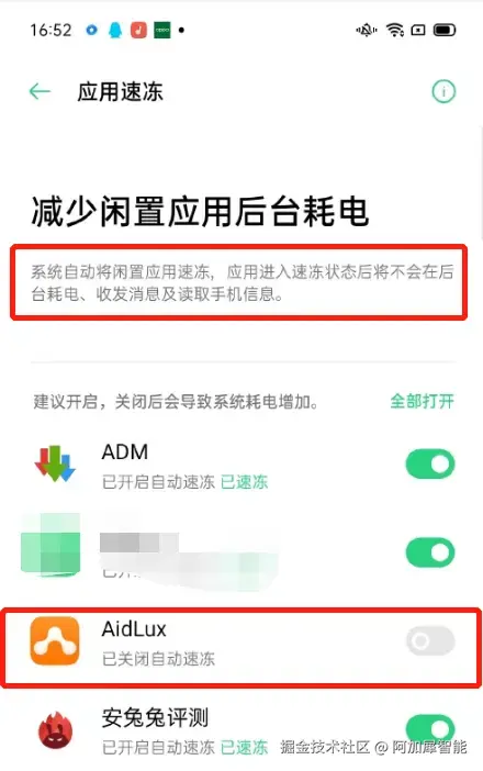 如果开启AidLux的应用速冻功能,会导致你的服务在后台运行的时候因为锁屏或耗电量过大而意外中断,所以需要关闭系统的该功能,灰色表示关闭