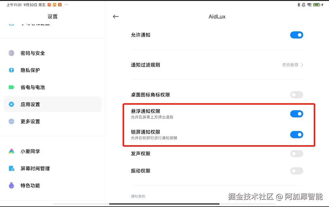 按照下图,分别打开悬乎通知权限和锁屏通知权限