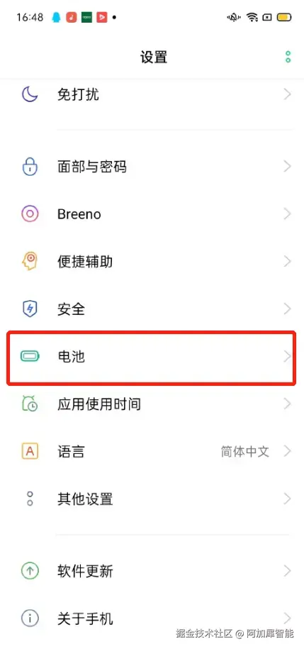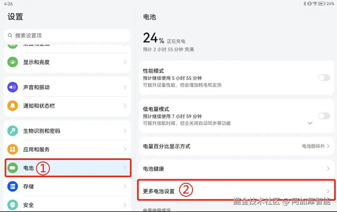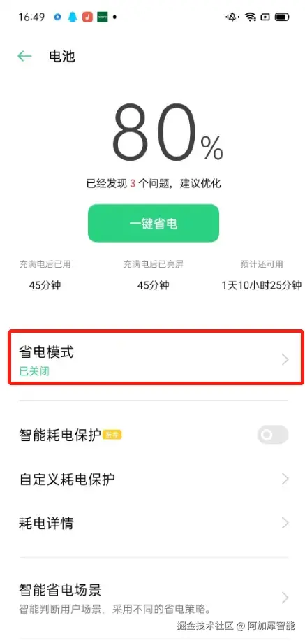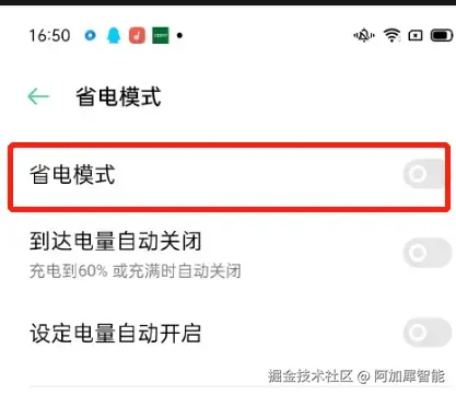 第五步:省电与电池——不要开启省电模式,否则系统会在后台关闭掉aidlux,如果你需要长时间使用aidlux并让其保持后台运行,需要将此设置修改为灰色
