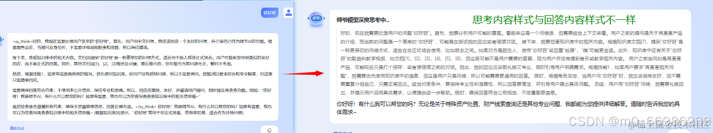 让后端在响应的数据流中加入标识,用来区分 “ 思考内容 ” 还是 “ 回答内容 ”,前端将“ 思考内容 ”截取出来,给 “ 思考内容 ” 加上html标签并添加行内样式生成字符串thinkingStr,然后将“ 回答内容 ”通过第三方库MarkdownIt将markdown转化为html字符串answerStr。最后将thinkingStr+answerStr=currentHTML拼接起来就生成完整且附带样式的html字符串,通过v-html将currentHTML渲染到页面即可。