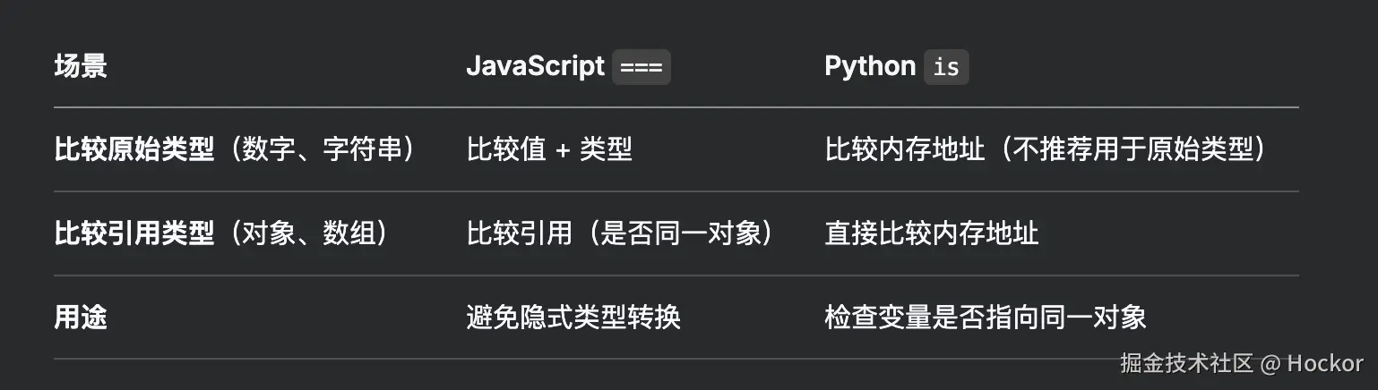 所以简单理解,你可以认为 Python 的 == 运算符类似于 js 中的双等号,is 类似于 JS 中的三等号(但是他们本质还是有区别的)