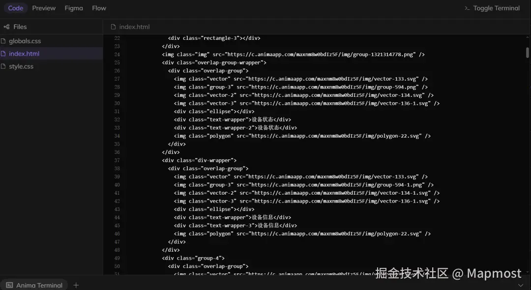 我上传了我的Figma设计稿,AnimaApp 很快就生成了相应的代码,并且提供了在线预览功能。