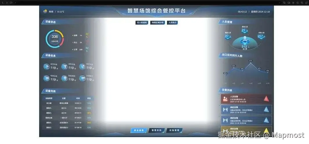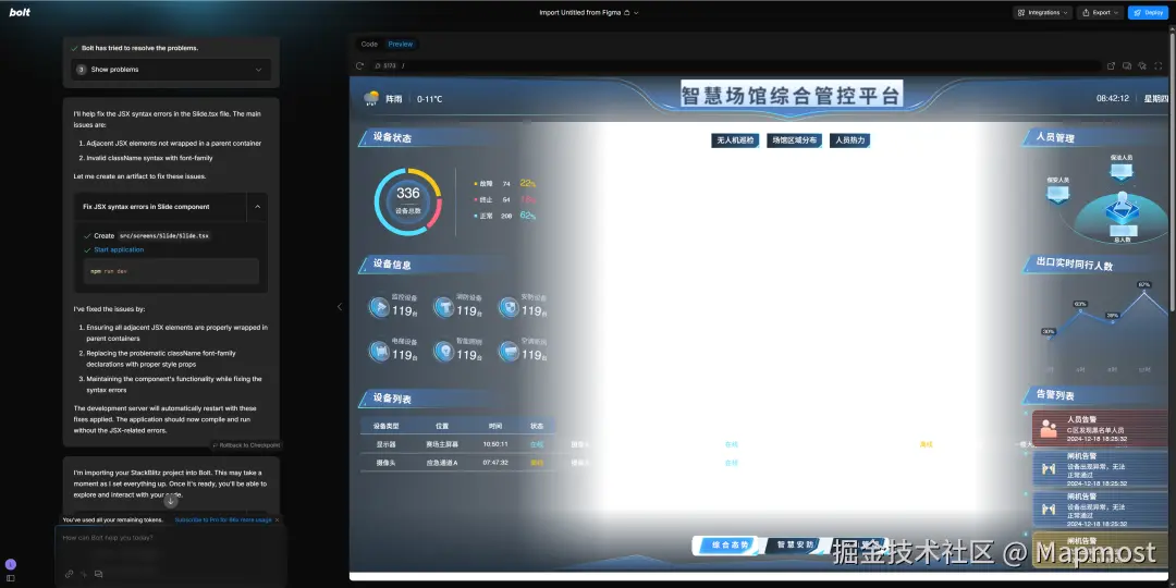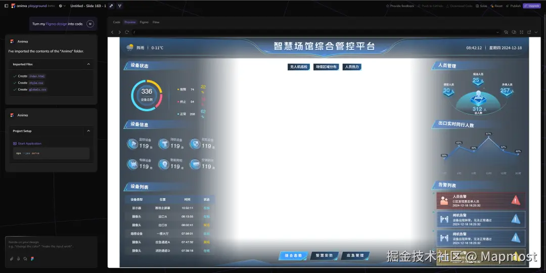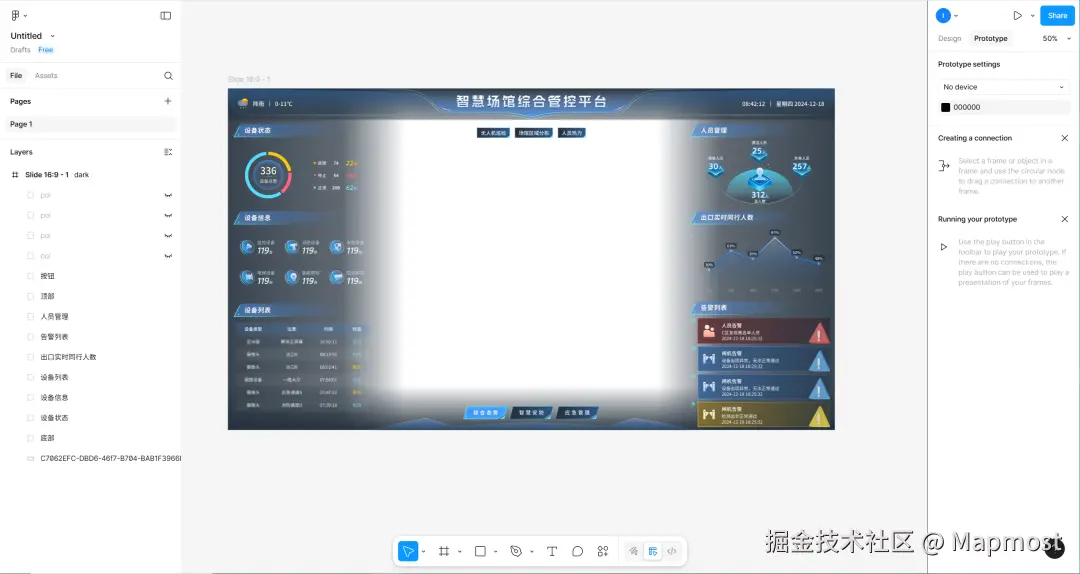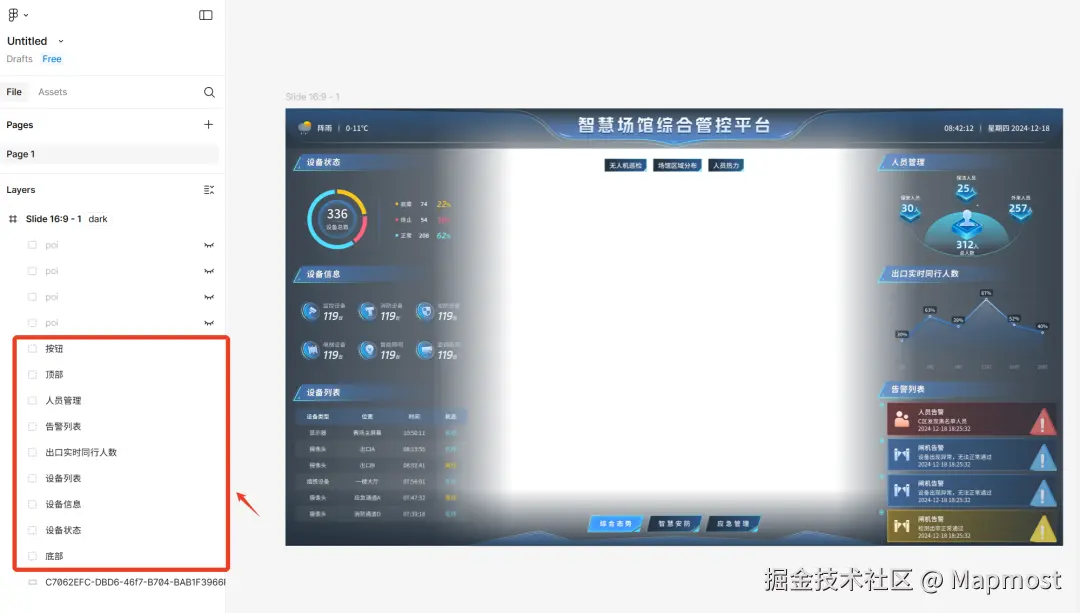 想要用 AI 生成代码,首先你得有一份完整的设计稿。我这里以MM开源示例中的智慧场馆设计稿为例,这个页面包含了一些系统的基本元素,包括标题、按钮、背景、图表等,它在Figma中长这样: