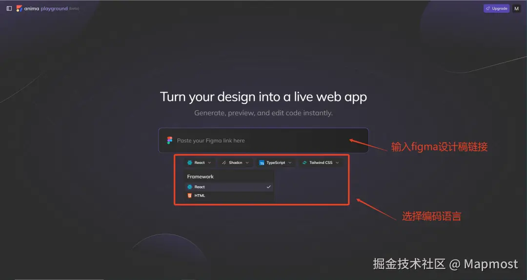 AnimaApp 是一个在线平台,它可以将 Figma设计稿转换为 HTML或者React工程。它的操作很简单,只需要输入Figma设计稿链接,选择编码语言后即可生成。