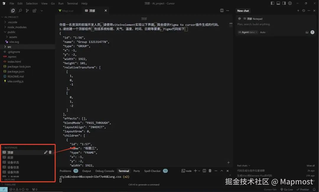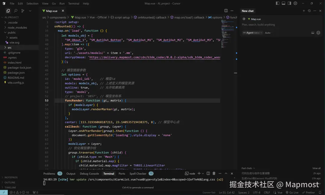 创建一个新的Vue工程,可以自己创建也可以命令Cursor创建,并在Cursor IDE中打开。为了使系统看起来更加完整,我先使用Mapmsot SDK for WebGL添加了三维场景模型。