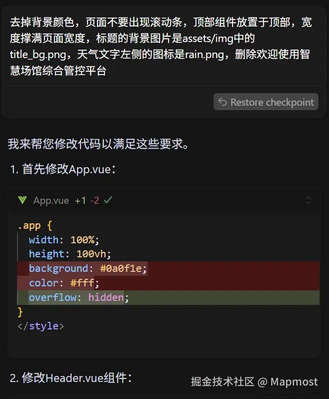 - 如果生成的效果有点偏差,可以命令Cursor逐步调整。我测试下来,改动的代码不是很多,大多都是颜色和位置的调整。