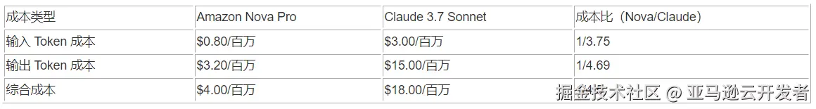 Nova Pro 成本仅为 Claude 3.7 Sonnet 的 23.1%。