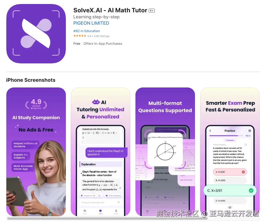 SolveX.AI 是一款由 PIGEON LIMITED 开发的教育类应用,在教育类 APP 中表现出色,位居前列,收获了众多用户的好评,评分高达 4.9 分,主打学习辅导,涵盖数学、科学、英语、历史等多学科,无论是应对学校课程,还是准备 SAT、ACT、AP、IGCSE 等考试,都能提供有效帮助。