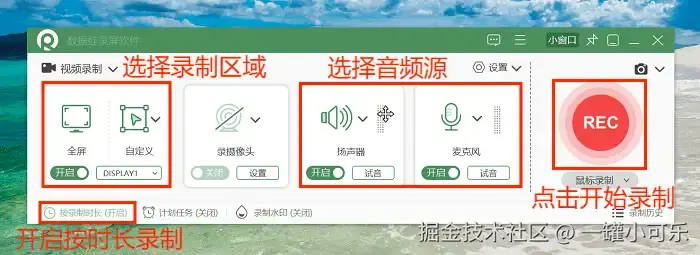 步骤2:接下来就可以自由选择录制的区域和音频源了,如果有需要,还可以开启 【按时长录制】 ,解放双手!设置完毕后点击 【REC】 开始录制屏幕。