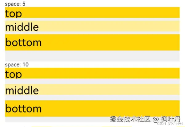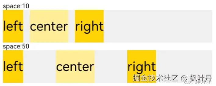 - 通过space参数设置主轴(排列方向)上子组件的间距。达到各子组件在排列方向上的等间距效果。