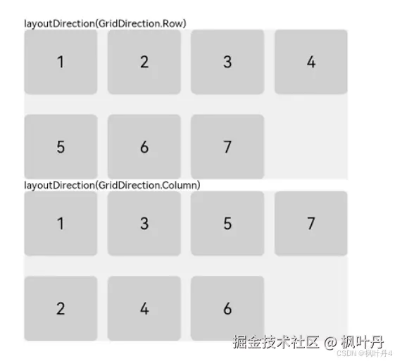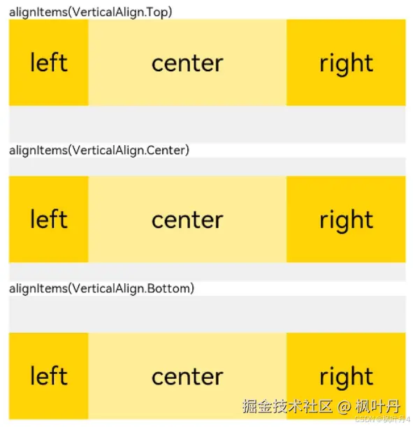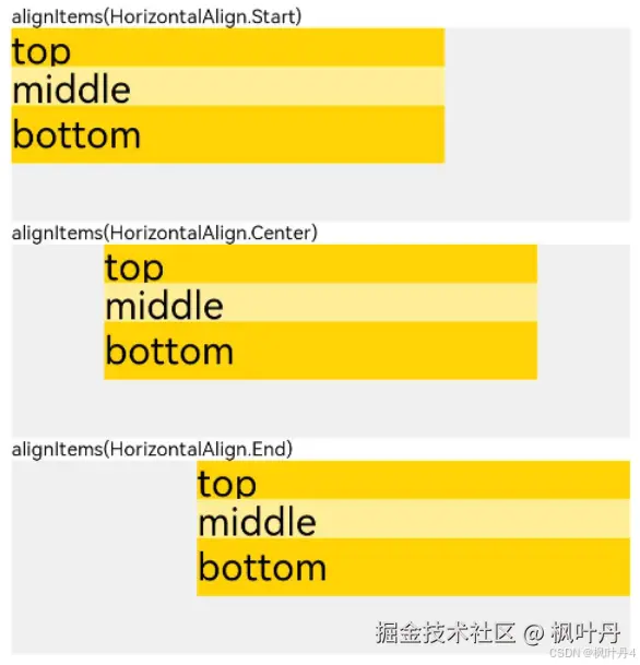 - 通过alignItems属性设置子组件在交叉轴(排列方向的垂直方向)的对齐方式。且在各类尺寸屏幕中,表现一致。其中,交叉轴为垂直方向时,取值为VerticalAlign类型,水平方向取值为HorizontalAlign类型。