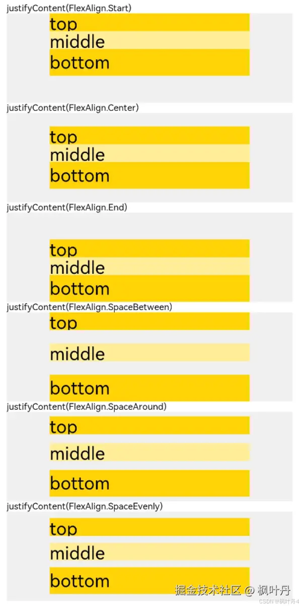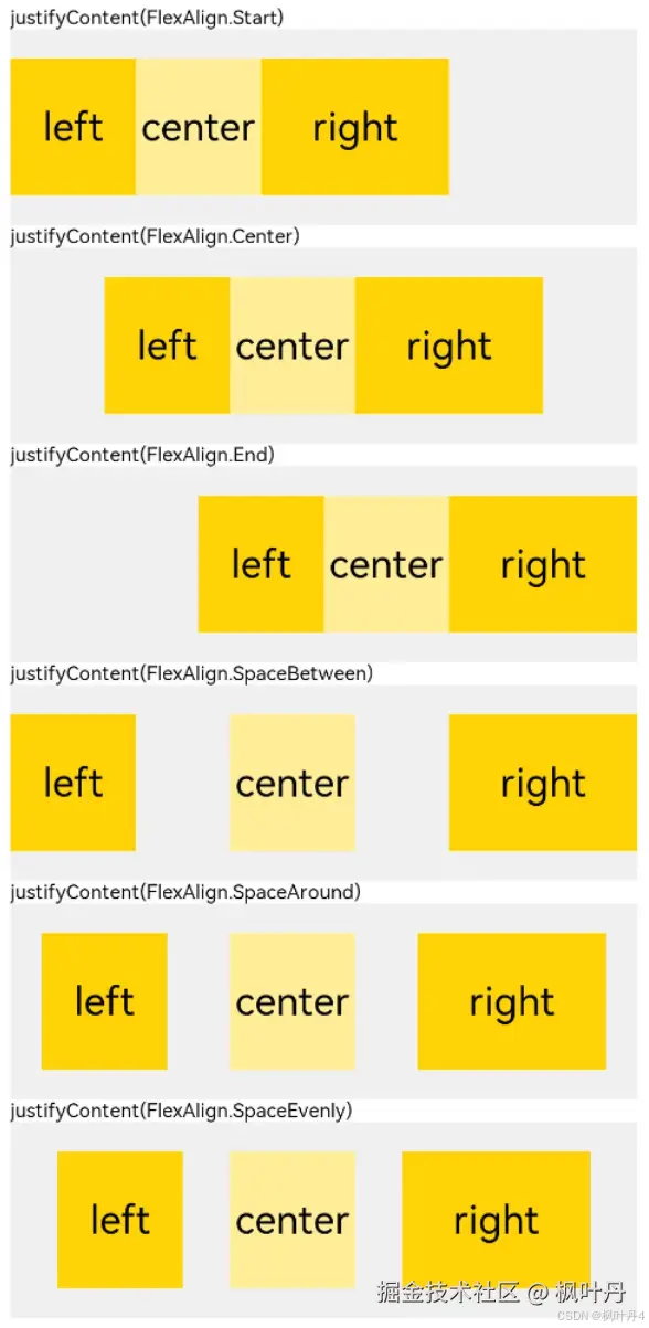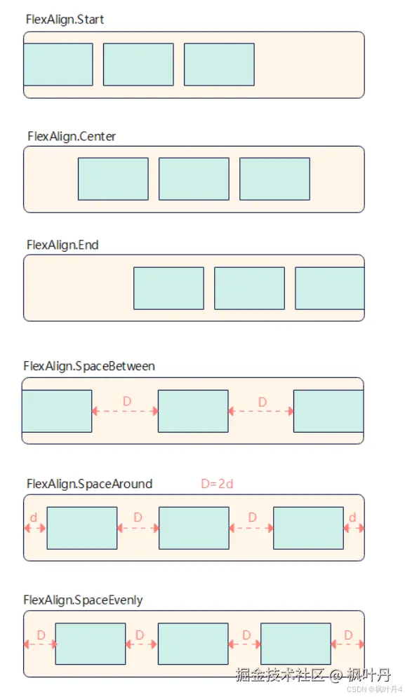 - 通过justifyContent属性设置子组件在主轴(排列方向)上的对齐方式。实现布局的自适应均分能力。取值为FlexAlign类型。