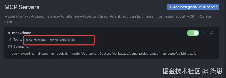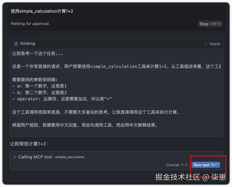 直接在cursor的对话框说:使用simple_calculation计算1+2