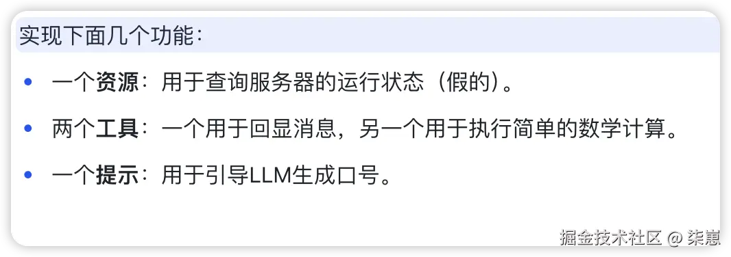 这个案例不解决任何实际问题,只为直观地展示MCP的资源 (Resources) 、工具 (Tools) 和 提示 (Prompts) 这三个核心概念。
