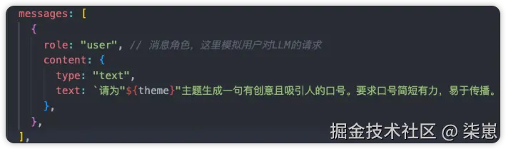 role: "user", // 消息角色,这里模拟用户对LLM的请求