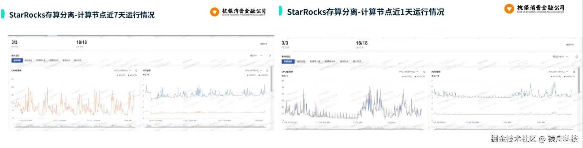 • 资源合理分配:计算节点与存储节点资源配比优化,监控显示,18个CN 节点和FE 节点组成的集群运行稳定,CPU利用率常年保持在50%以下,在下午和凌晨的业务高峰期也能从容应对,确保系统稳定运行;