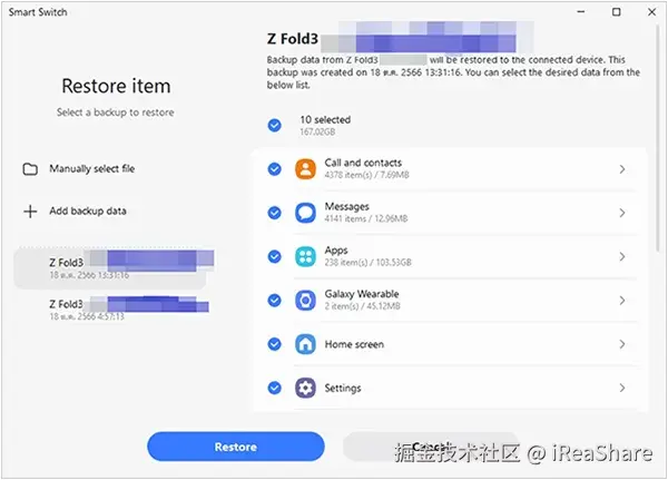 是的,设置完成后,您可以使用 iReaShare Android Manager 将备份数据恢复到 Android 手机。这款软件允许您从备份中恢复数据,且不受时间限制,并且恢复的数据不会替换目标设备上的现有数据。