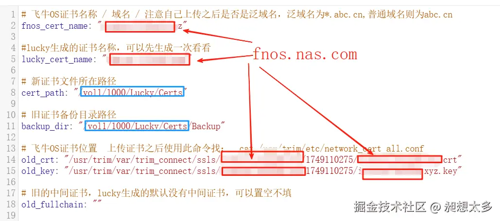 - 红框处都替换为 fnos.nas.com。你需要根据自己的自定义域名进行替换,这里仅仅是以这个域名为例。