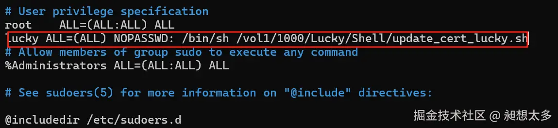 lucky ALL=(ALL) NOPASSWD: /bin/sh /vol1/1000/Lucky/Shell/update_cert_lucky.sh