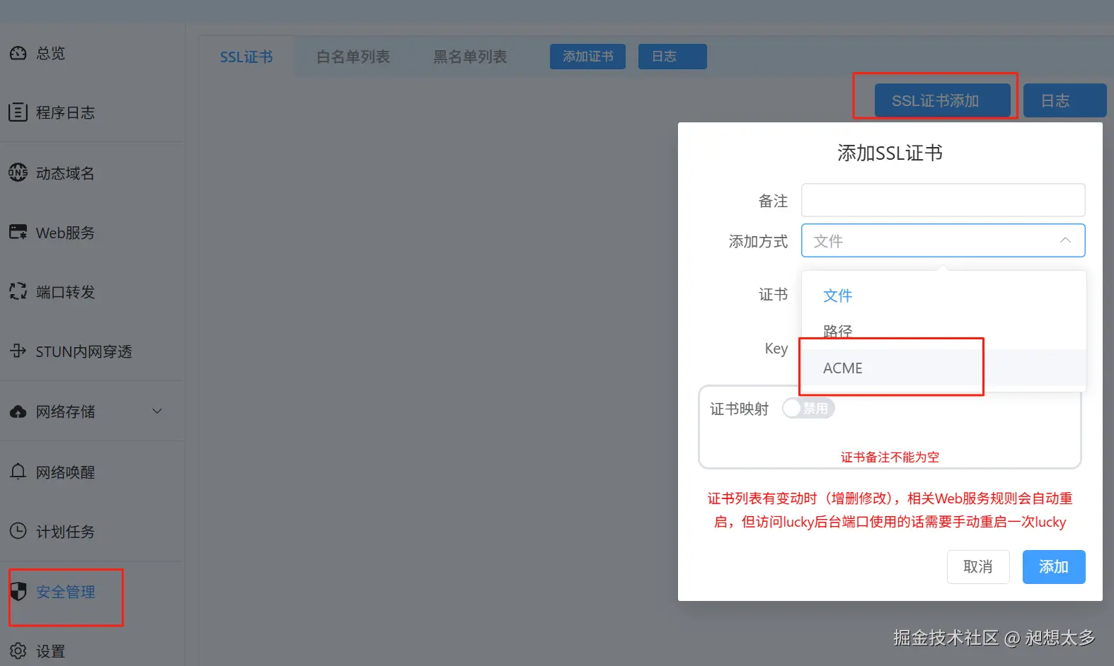 安全管理,点击SSL证书添加按钮打开添加证书页面,在添加方式下拉框切换到ACME。 -