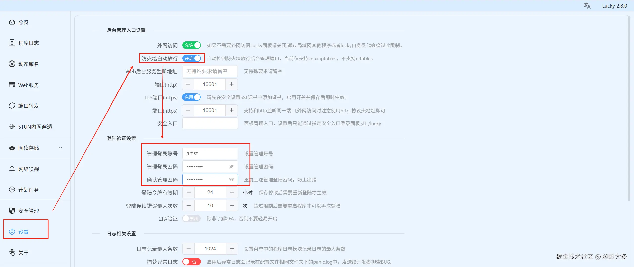 设置开启防火墙自动放行并修改默认的账号和密码。 -