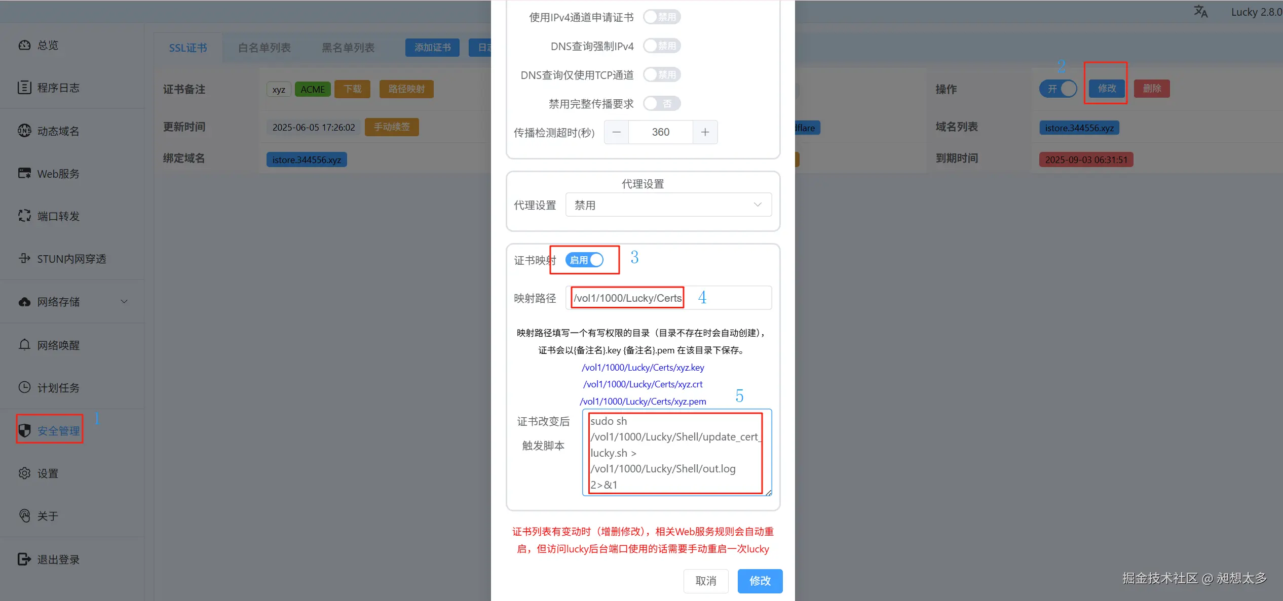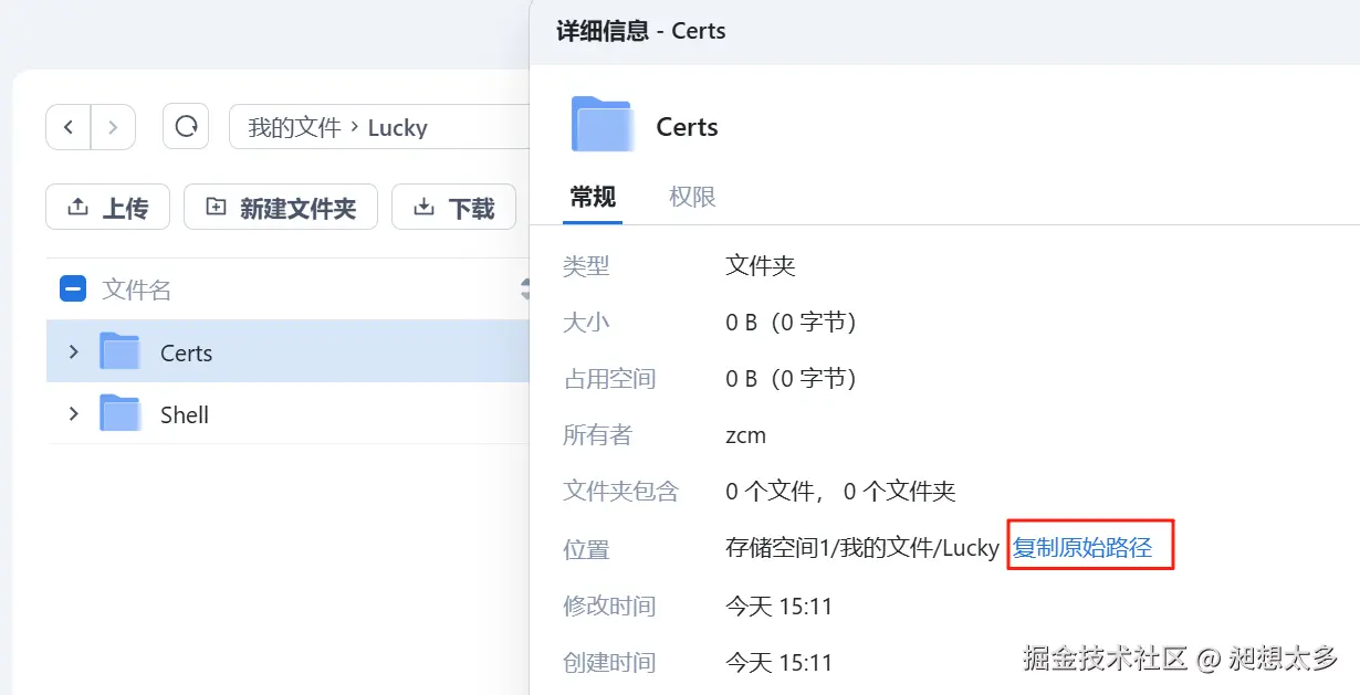 Certs目录的绝对路径:/vol1/1000/Lucky/Certs, 需要你根据自己的目录进行替换。