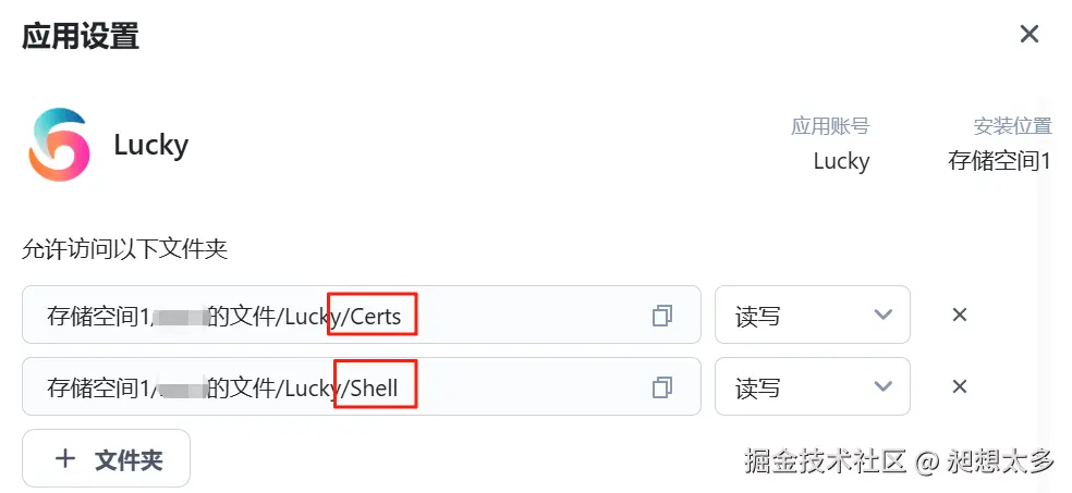 文件夹添加授权目录后点击确定按钮保存。目录选择上面新建的/存储空间1/*/Lucky/Certs和/存储空间1/*/Lucky/Shell.